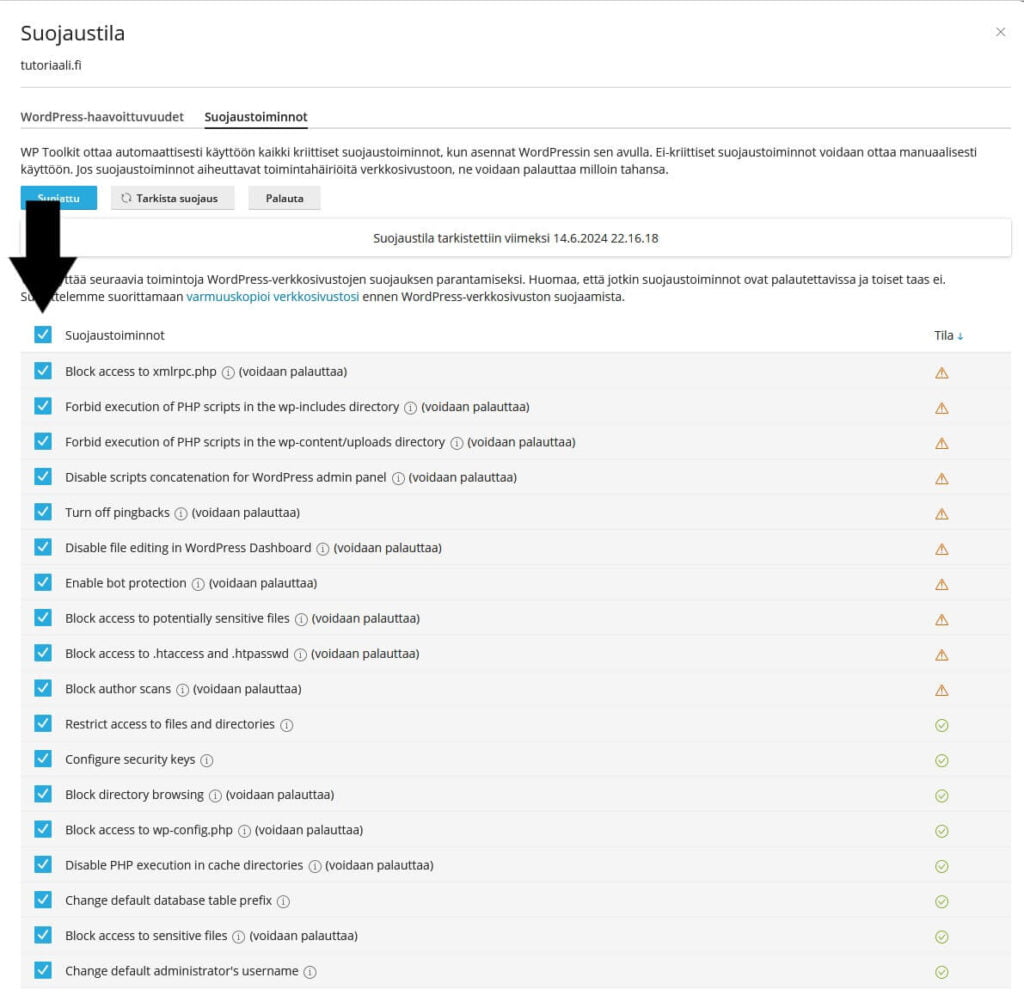 Klikkaa ruudusta, johon kuvassa merkattu nuoli osoittaa. Näin otat kaikki tietoturvaa parantavat ominaisuudet käyttöön nopeasti ja helposti.