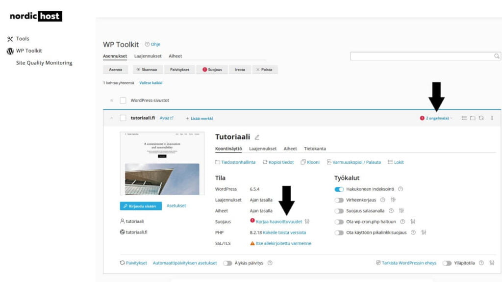 Voit maksimoida WordPress-sivustosi turvallisuuden aloittamalla WP Toolkit -työkalusta. Kyseinen työkalu varoittaa sinua havaituista tietoturva-aukoista ja kehottaa sinua korjaamaan ne. Siirry WP Toolkit osioon klikkaamalla vasemmalta WP Toolkit. Sen jälkeen näet listan asennetuista WordPress sivuista. Jos et ole asentanut vielä WordPressiä, lue lisää WordPressin asennuksesta ja käyttöönotosta klikkaamalla tästä.